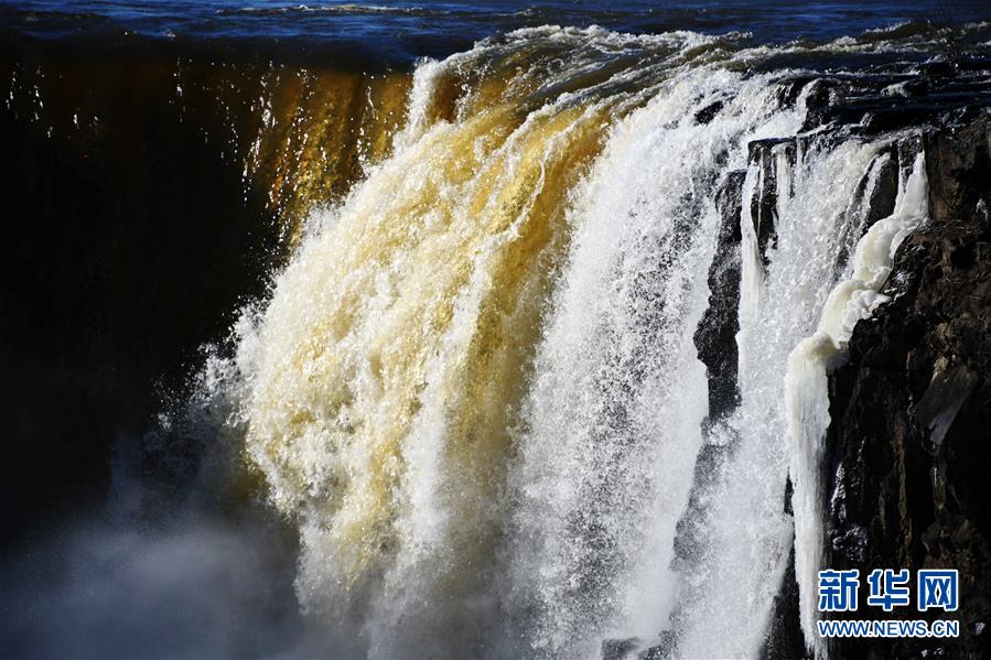 吊水樓瀑布的冬季飛瀑奇觀(12月5日攝)。 受上游來水量大和近期氣溫偏高等因素影響,位于黑龍江東南部的火山堰塞湖——鏡泊湖的吊水樓瀑布水量充沛,展現(xiàn)出飛流直下、水霧升騰的冬季奇觀,引來許多游人觀賞。 新華社記者王建威攝