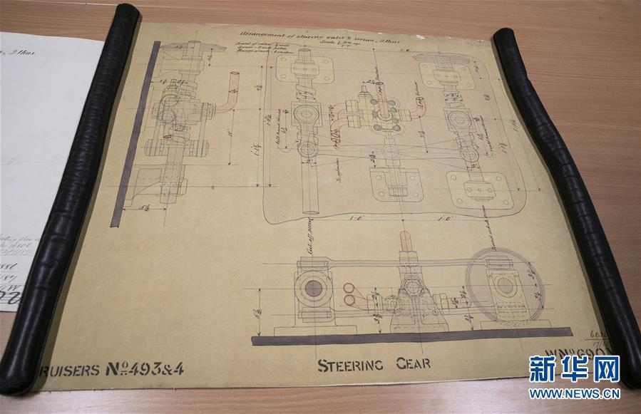 這是11月2日在英國紐卡斯?fàn)柕奶┒鳌枡n案館拍攝的致遠(yuǎn)艦設(shè)計(jì)圖紙。 新華社記者日前在紐卡斯?fàn)柼┒鳌枡n案館查找北洋海軍史料時發(fā)現(xiàn)一套七張、檔案名為“中國巡洋艦舵機(jī)設(shè)計(jì)圖”的原始圖紙。塵封百年,甲午海戰(zhàn)中抗擊日艦后沉沒的清北洋海軍致遠(yuǎn)艦部分原廠設(shè)計(jì)圖紙?jiān)谄浣ㄔ斓亍~卡斯?fàn)柺械囊患覚n案館首次被發(fā)現(xiàn),為打撈那段悲壯的歷史提供了重要參考。 新華社記者 韓巖 攝