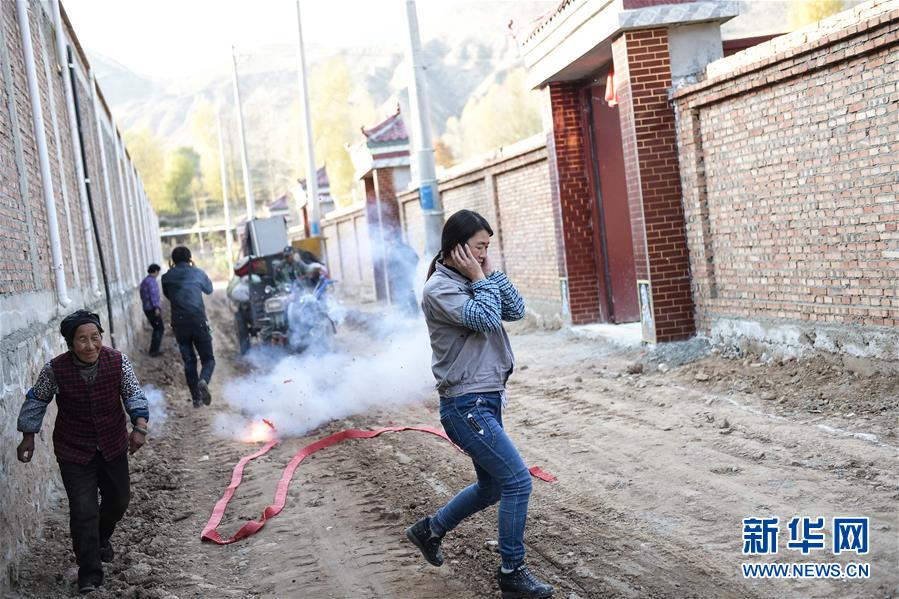 在青海省民和回族土族自治縣松樹(shù)鄉(xiāng)牙合移民新村,貧困戶(hù)胡秀英家在新家的門(mén)口放鞭炮慶祝(11月2日攝)。