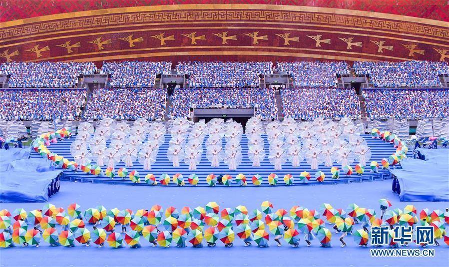 12月10日,廣西壯族自治區(qū)成立60周年慶祝大會(huì)在廣西體育中心隆重舉行。這是慶祝大會(huì)上的群眾文藝表演。 新華社記者 申宏 攝