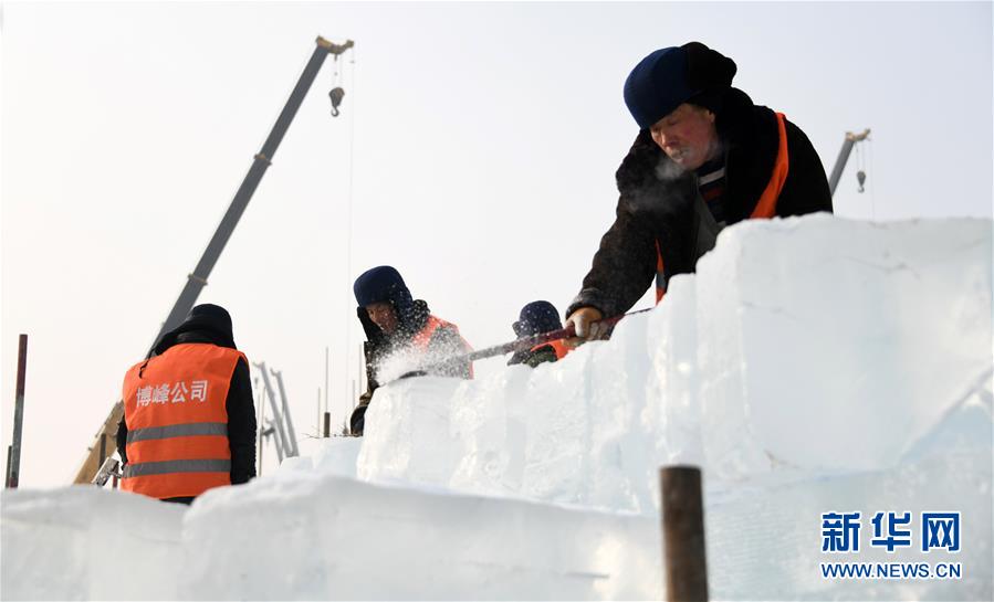 12月13日,工人在第二十屆哈爾濱冰雪大世界園區(qū)施工。新華社記者 王建威 攝
