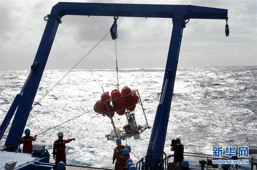 考察隊(duì)員在“沈括”號(hào)上回收“彩虹魚(yú)”著陸器(12月16日攝)。