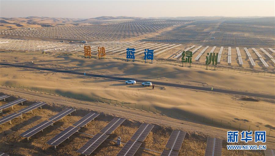 位于庫(kù)布其沙漠腹地的達(dá)拉特光伏發(fā)電應(yīng)用領(lǐng)跑基地一期500兆瓦項(xiàng)目(12月13日無(wú)人機(jī)拍攝)。 新華社記者 彭源攝