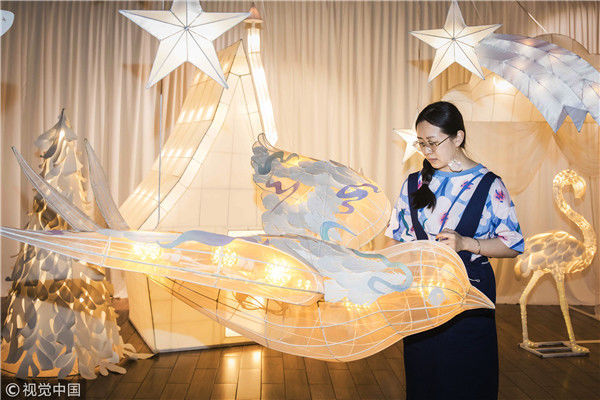 2018年5月6日,廣州,在天河區(qū)一家大商場辦個展時,用紙片做成的北極熊、大松樹、火烈鳥、紙房子在光線的配合下美輪美奐,吸引了很多顧客駐足?!皫缀趺總€人一看到,都會走進那個夢幻的場景里,和這些紙雕一起合影?!眻D片攝于2018年5月6日。