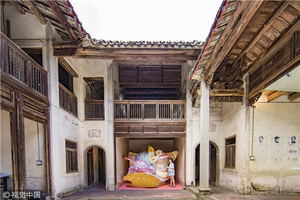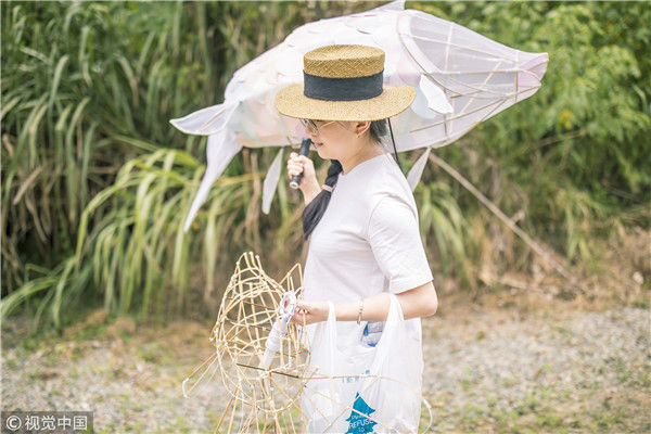2018年8月10日,廣東揭陽,溫秋雯把獅子頭扒得只剩下骨架和包布,之后將不同顏色的紙片裁剪成三角形、鱗片形等不同形狀,作為裝飾獅子的皮毛,粘在獅子身上,獅子的鼻子則是用彩紙條以手鞠的方式纏繞而成,在獅頭內部安裝了一盞白熾燈,一打開電燈,萌態(tài)可掬的獅子便呈現(xiàn)在人們眼前。紙片的顏色以淡粉、淡綠、淺白色為主,就這樣,人們平時印象中威猛的南獅,被改裝得萌萌的。圖為2018年8月10日,廣東省梅州市,溫秋雯和她的紙雕作品。