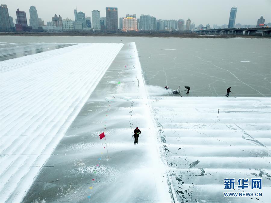 在松花江哈爾濱段江面,工人們在進行切割和采冰工作(12月12日無人機拍攝)。 黑龍江哈爾濱市的冰雪主題樂園哈爾濱冰雪大世界的采冰和建設工作近日拉開帷幕。為保證足夠的優(yōu)質冰供給,每天有近千名采冰人和700多輛運冰車參與到采冰工作。 新華社記者 王松 攝