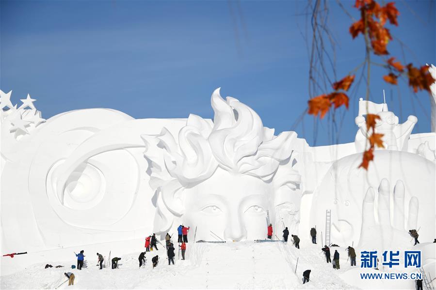 12月24日,雪雕師在制作太陽島雪博會主塑“星河之旅”。 當日,哈爾濱太陽島雪博會主塑露出“芳容”。本屆雪博會主塑“星河之旅”長106米,高32米,寬20米,用雪量達4萬立方米。 新華社記者 王建威 攝