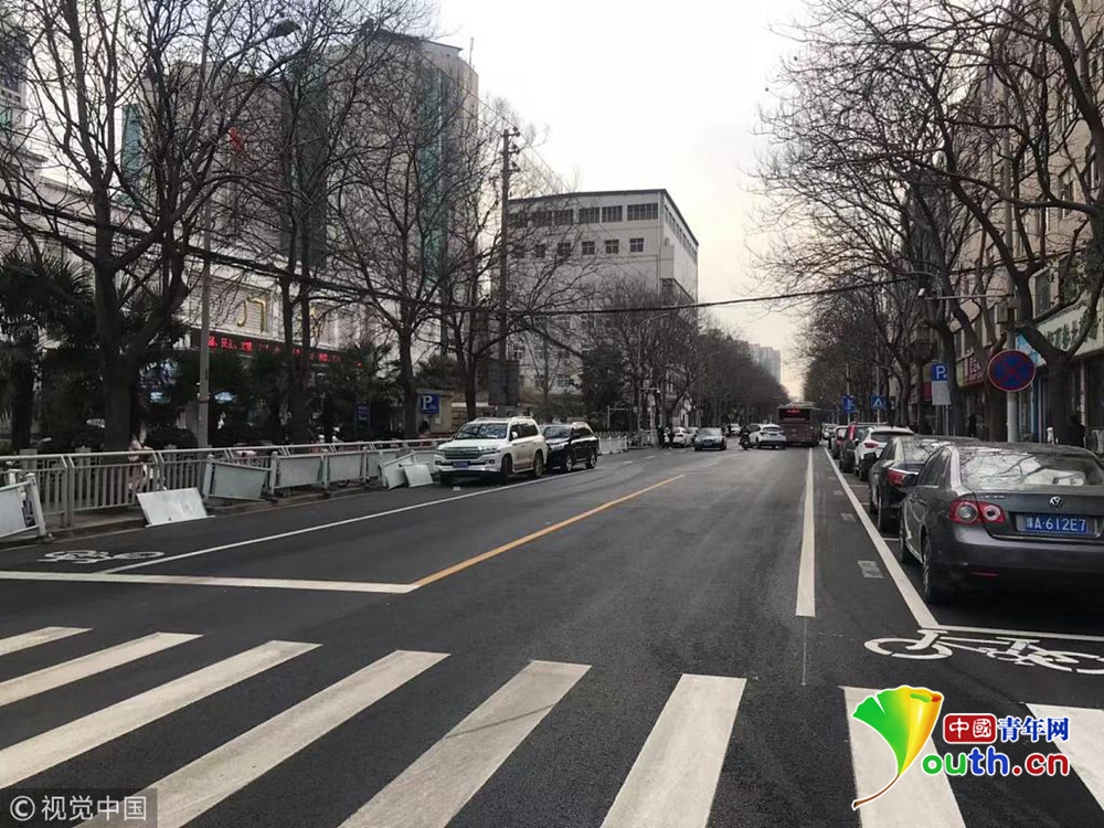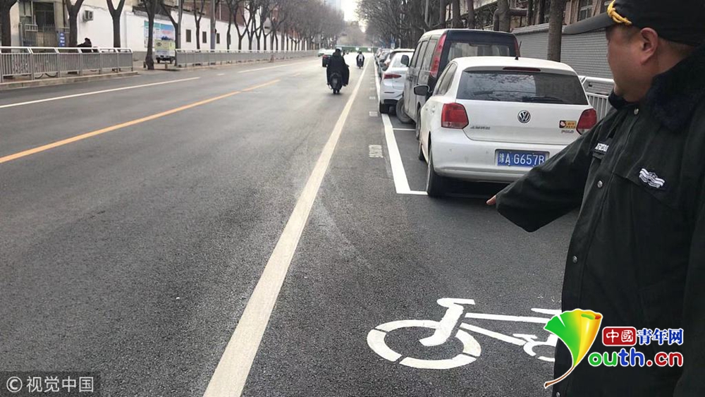現(xiàn)場(chǎng),文化宮路與友愛路口附近,新鋪好的路面被劃上了嶄新的行車線和停車位標(biāo)線。從文化宮路和友愛路交叉口向北,道路東側(cè)的非機(jī)動(dòng)車道被停車位占去后,僅剩下0.8米左右的寬度。同樣在路口南側(cè),道路西側(cè)的非機(jī)動(dòng)車道也被新劃的停車位占去,僅剩不足1米的寬度。