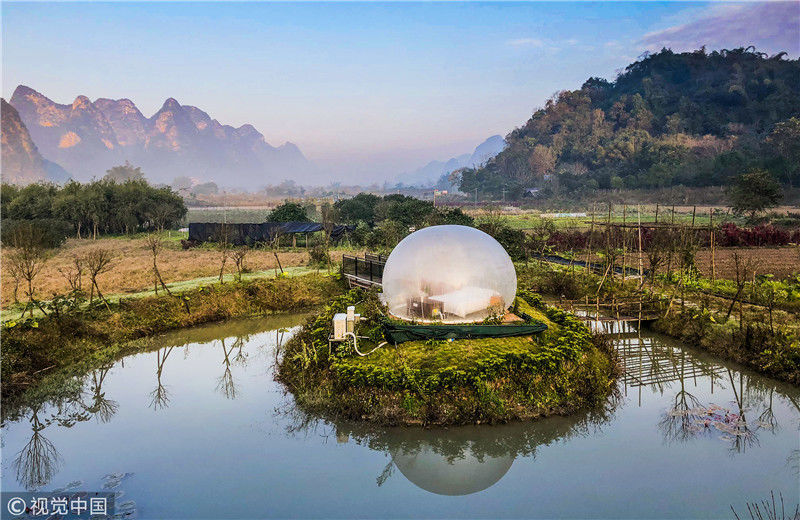 最近這幾年,中國的民宿風越刮越猛,各地精品民宿紛紛如雨后春筍一樣冒出了,而且他們用其更獨特的設(shè)計感吸引著人們的目光。其實對比星級酒店,民宿最大的優(yōu)勢,就是設(shè)計風格更獨特,更具藝術(shù)感,也更符合人們的審美要求,同時又能做到比星級酒店更舒適,更適合度假,所以大家現(xiàn)在出行都更熱衷于選擇民宿。圖為2018年12月18日,廣西桂林,陽朔縣遇龍河畔。晨光中的泡泡屋。棋簿紫/視覺中國