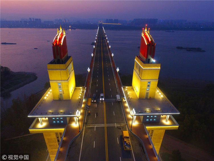 2018年12月13日,江蘇南京,“一橋飛架南北,天塹變通途?!弊鳛槲覈?guó)第一座自行設(shè)計(jì)和建造的雙層鐵路、公路兩用橋,南京長(zhǎng)江大橋在我國(guó)橋梁史上的重要地位不言而喻。從1968年建成后的48年間,它就如同一條巨龍,始終在長(zhǎng)江上默默守護(hù)著人來(lái)車(chē)往。南京長(zhǎng)江大橋上層是公路橋,下層為雙軌復(fù)線鐵路橋,連接津浦鐵路與滬寧鐵路干線,是我國(guó)南北交通要津和命脈。近年來(lái),由于南京長(zhǎng)江大橋公路橋的實(shí)際通行荷載遠(yuǎn)超原先設(shè)計(jì)標(biāo)準(zhǔn),不僅橋面上擁堵?,F(xiàn),橋梁本身的種種“病害”也日益加深。圖為2018年12月13日,夜幕降臨,南京長(zhǎng)江大橋歸位后的玉蘭花燈重新點(diǎn)亮。大橋玉蘭花燈柱共有299根,每根燈柱上有5盞玉蘭花燈,1大4小,一共1495盞。方東旭/視覺(jué)中國(guó)
