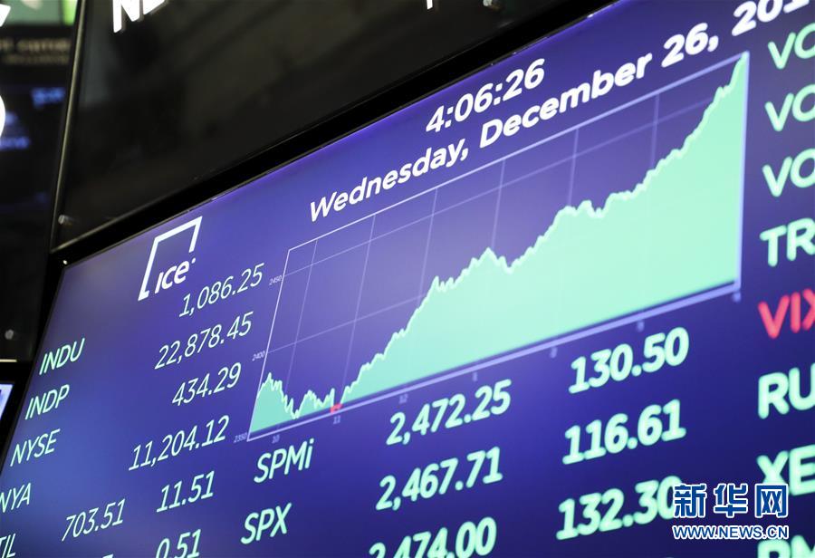 12月26日,美國(guó)紐約證券交易所的電子屏顯示當(dāng)天交易信息。新華社記者 王迎 攝
