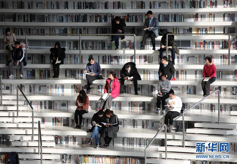 12月27日,讀者在天津?yàn)I海新區(qū)圖書(shū)館中庭的“書(shū)山”上看書(shū)。 濱海新區(qū)圖書(shū)館位于天津?yàn)I海文化中心,2017年10月1日正式開(kāi)館,設(shè)計(jì)立意為“濱海之眼”和“書(shū)山有路勤為徑”。圖書(shū)館現(xiàn)有藏書(shū)60多萬(wàn)冊(cè),一年多來(lái)接待讀者約280萬(wàn)人次,已成為濱海新區(qū)的文化“新地標(biāo)”。 新華社記者伍婧丹攝