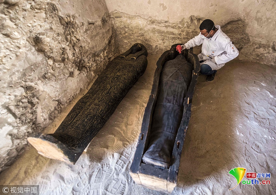 當地時間2018年11月24日,埃及盧克索,考古學家在當地發(fā)掘出一處墓穴,在其中發(fā)現石棺、木乃伊等文物,時間可追溯至公元前4-7世紀。圖片來源:視覺中國