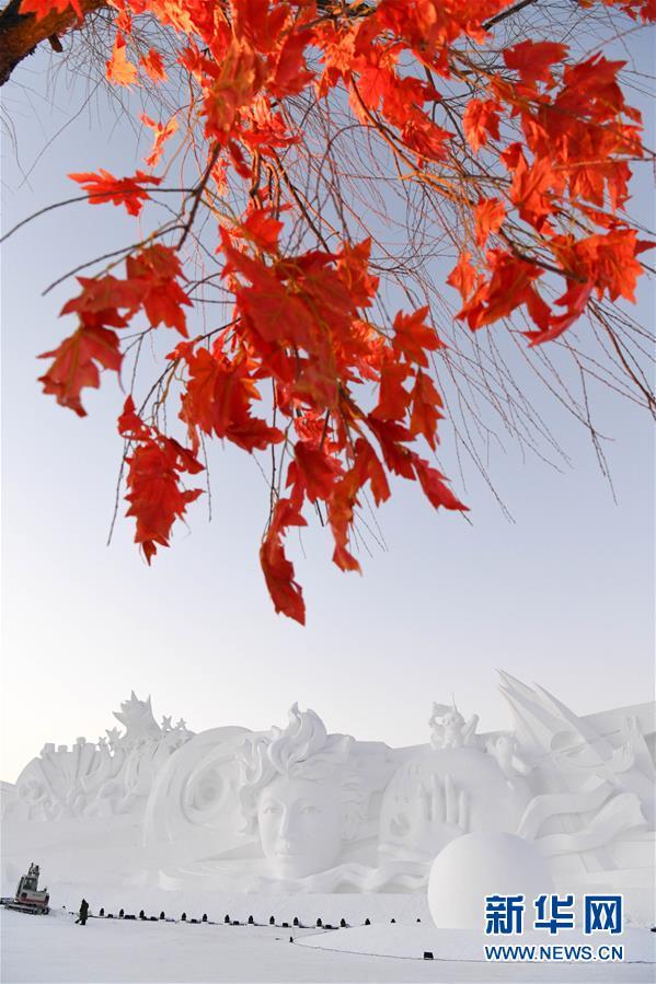 12月28日,工作人員在雪塑《星河之旅》前作業(yè)。