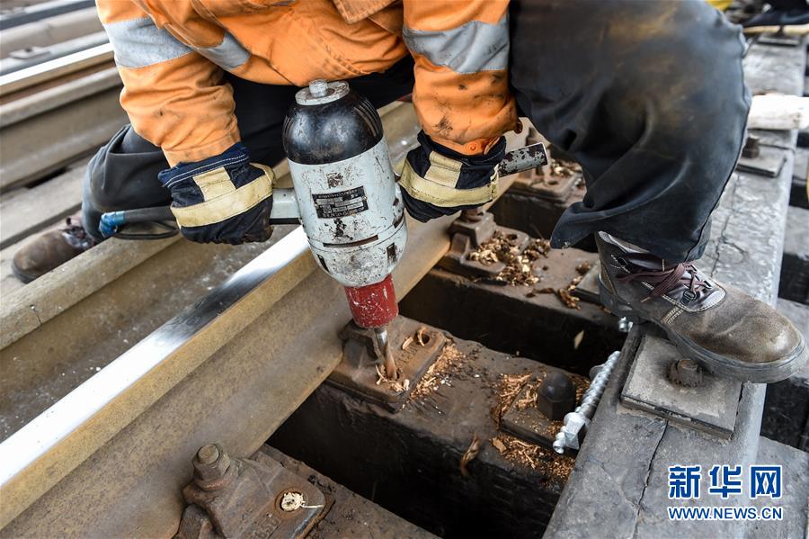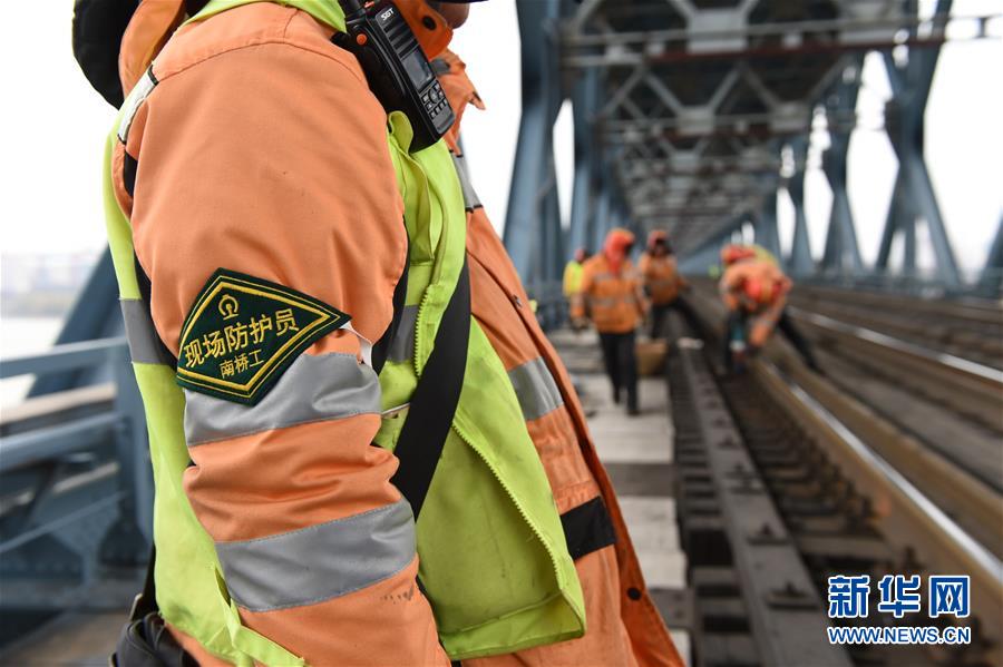 線路工們在南京長江大橋鐵路橋進行木枕改道作業(yè)(12月27日攝)。