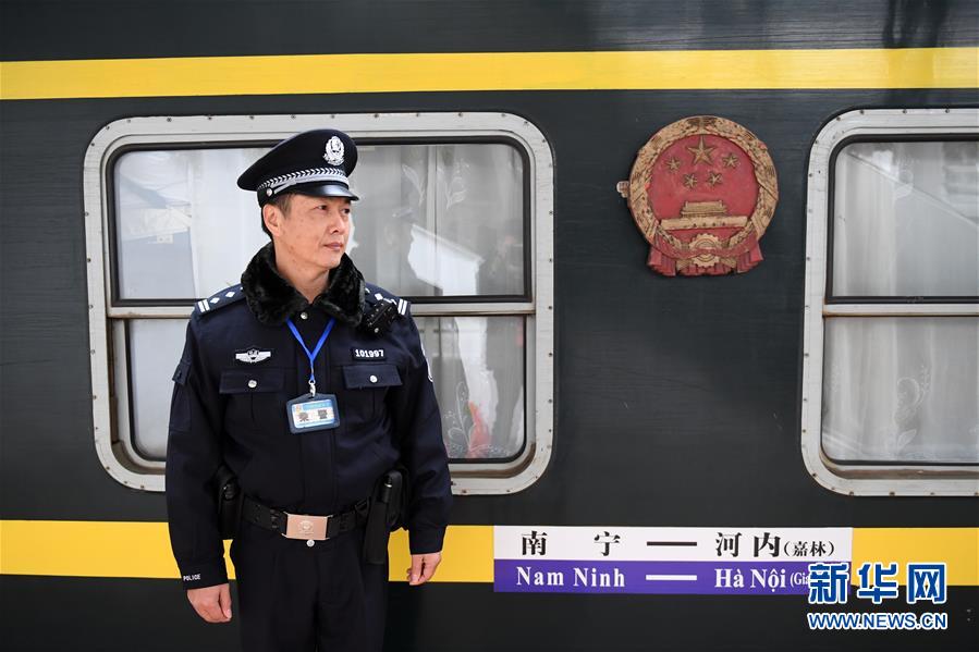 1月1日,在廣西南寧火車站,楊鐵鳴在剛剛從越南河內(nèi)(嘉林)開來的列車旁值勤。楊鐵鳴是第一趟中越國際客運列車的當(dāng)班乘警,現(xiàn)在依然在這趟列車上值守。 新華社記者陸波岸攝