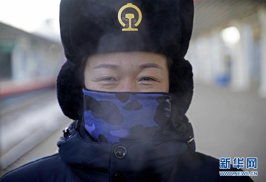 1月11日,在滿洲里火車站站臺(tái),“金鑰匙”服務(wù)臺(tái)客運(yùn)員在嚴(yán)寒中等待列車進(jìn)站。