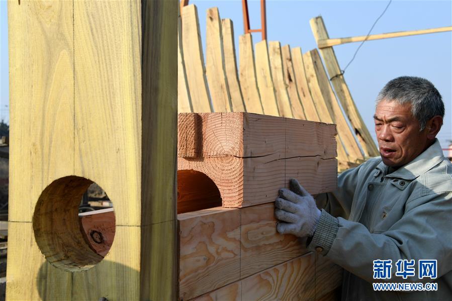 在青島紅雙木造船廠,一位造船師傅在檢查安裝加固龍骨(1月10日攝)。新華社記者 李紫恒 攝