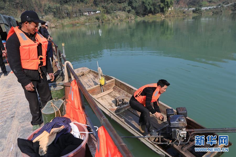 1月22日,何銀祥(左)在駕駛小船,他駕駛的小船是大船的動(dòng)力來(lái)源。 新華社記者 歐東衢 攝