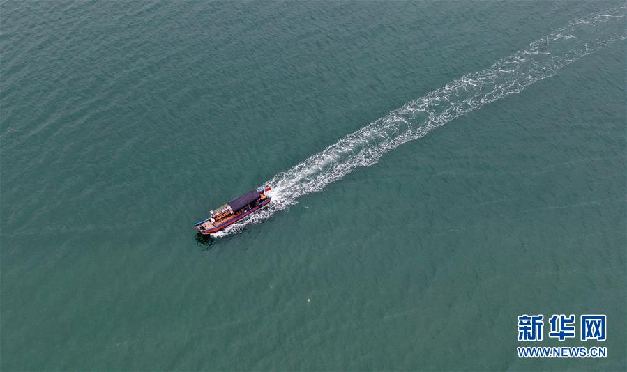 一艘游船行駛在防城港金灘海域(4月16日無人機拍攝)。新華社記者張愛林攝