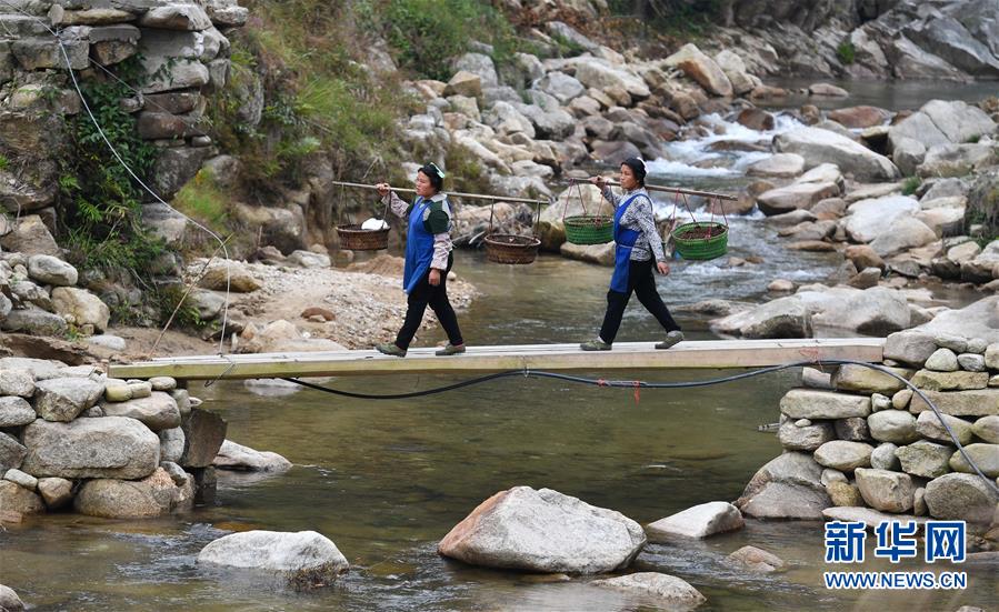 在黔桂烏英苗寨,村民扛著秧苗過(guò)河,準(zhǔn)備插秧(4月16日攝)。 新華社記者 黃孝邦 攝