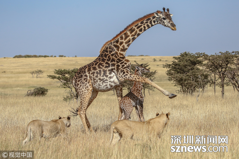 深圳新聞網(wǎng)訊 當(dāng)?shù)貢r間2018年8月15日,肯尼亞馬賽馬拉,當(dāng)?shù)貙?dǎo)游詹姆斯·納帕索(James Nampaso)拍攝到一群獅子圍攻母長頸鹿和她的幼崽。盡管長頸鹿勇敢地抵抗獅群的進攻,但當(dāng)一頭母獅跳上它的脊背時,它被分散了注意力,使得獅群最終捕獲了它的孩子。
