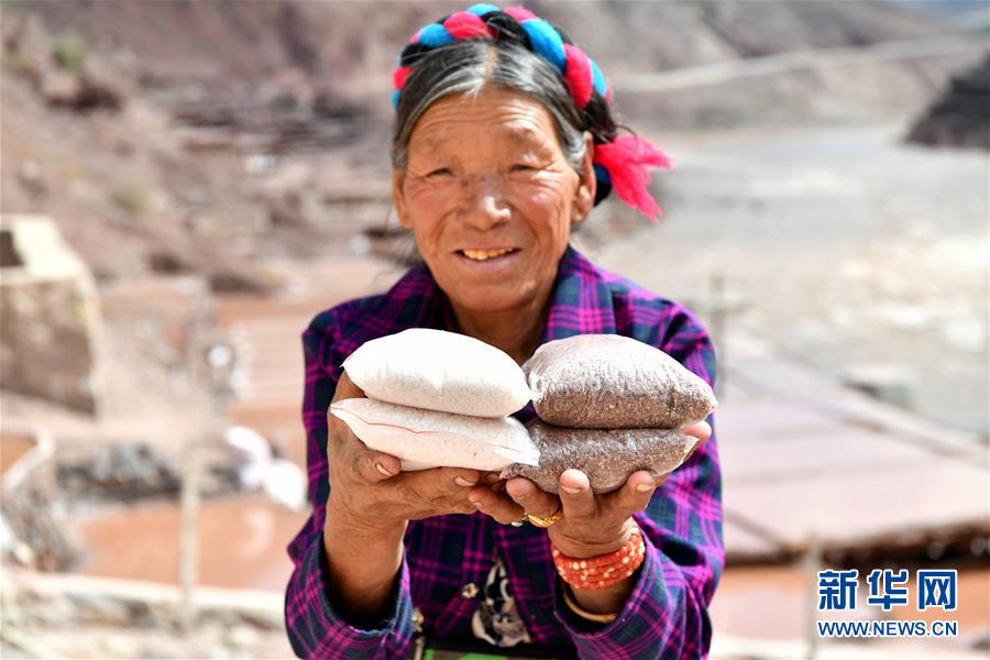 5月22日,西藏納西民族鄉(xiāng)加達(dá)村村民曲措展示所賣鹽類商品。位于西藏昌都芒康縣瀾滄江畔的古鹽田,至今仍保持最原始的手工曬鹽方式。據(jù)史料記載,唐朝時(shí)期當(dāng)?shù)鼐烷_始曬鹽。鹽田在瀾滄江兩岸依山而建,由多根木柱搭架,架上用透水性強(qiáng)的泥土鋪成平面夯實(shí),當(dāng)?shù)鼐用駨臑憸娼系柠}井、鹽池中取出鹵水倒入鹽田,經(jīng)陽(yáng)光蒸曬、風(fēng)干,結(jié)晶成鹽。遠(yuǎn)遠(yuǎn)望去,鹽田錯(cuò)落有致,田中鹵水宛若鏡面,形成壯麗奇觀。新華社記者李鑫 攝