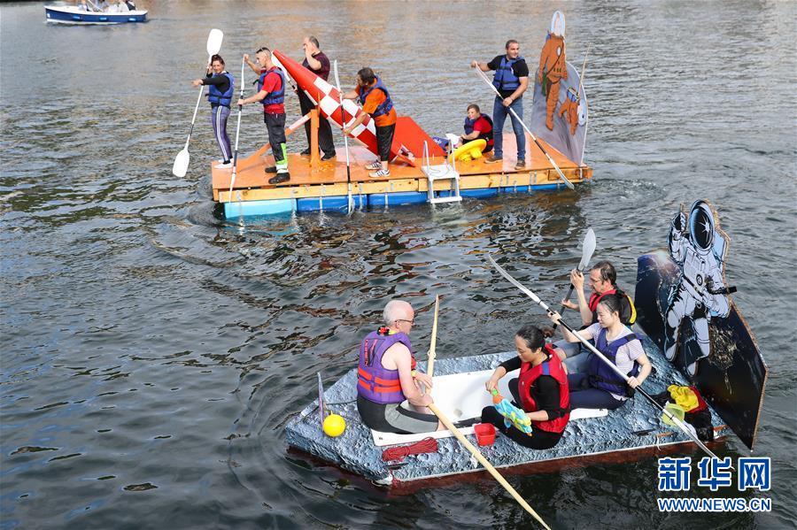 當(dāng)日,一年一度的水上狂歡活動(dòng)“浴缸劃船節(jié)”在比利時(shí)迪南舉行。該活動(dòng)要求參賽者制造的船上至少帶有一個(gè)浴缸,參賽者需完成一千米的水上巡游,最后根據(jù)設(shè)計(jì)創(chuàng)意及現(xiàn)場(chǎng)表演而非行進(jìn)速度評(píng)選出優(yōu)勝者?!霸「讋澊?jié)”始于1982年,今年的主題是"我們?cè)谠虑蚵?quot;。 新華社記者 張鋮 攝