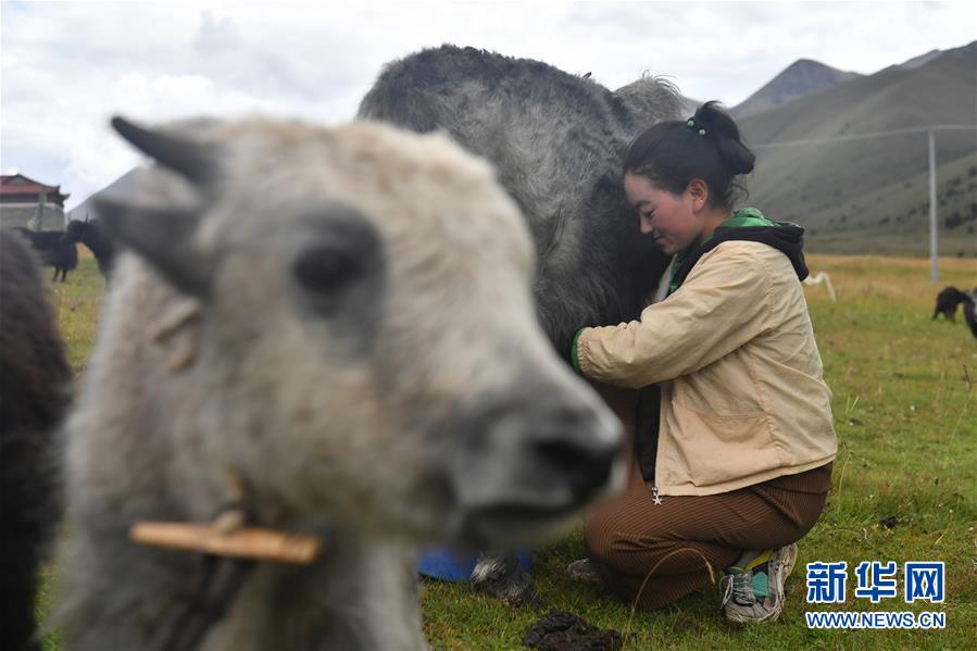 9月8日,在四川省康定市呷巴鄉(xiāng)俄達門巴村附近,一名藏族姑娘給牦牛擠奶。新華社記者孫瑞博攝