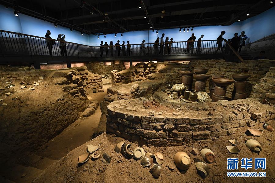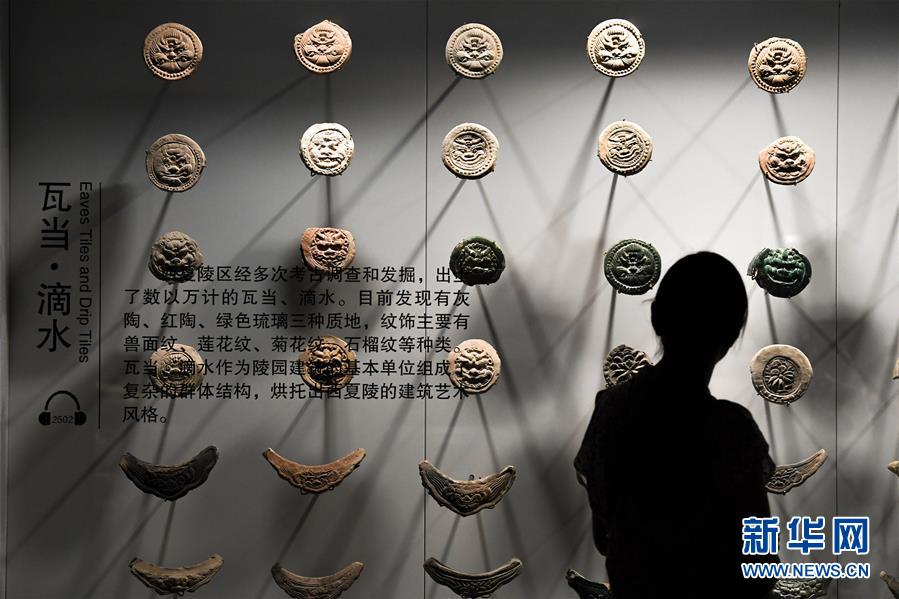 10月2日,游客在寧夏銀川市西夏陵景區(qū)的西夏博物館觀看展出的瓦當(dāng)、滴水。 新華社記者 馮開華 攝