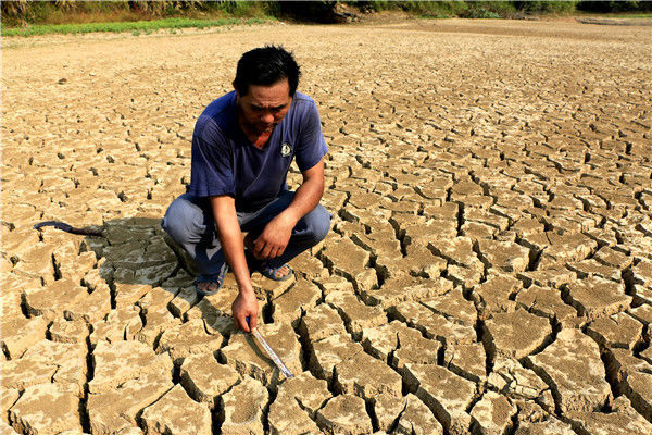 當(dāng)?shù)貢r(shí)間2016年5月13日,柬埔寨甘丹省,受厄爾尼諾現(xiàn)象影響,當(dāng)?shù)卦庥龈珊堤鞖?,池塘干涸開(kāi)裂。