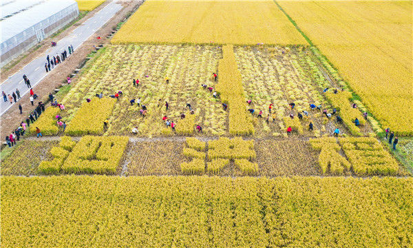 2019年10月26日,江蘇省宿遷市泗洪縣在稻米小鎮(zhèn)石集鄉(xiāng)舉行具有地方特色的割稻比賽,近60名選手在金色稻田揮舞銀鐮、緊張角逐。張連華/視覺(jué)中國(guó)