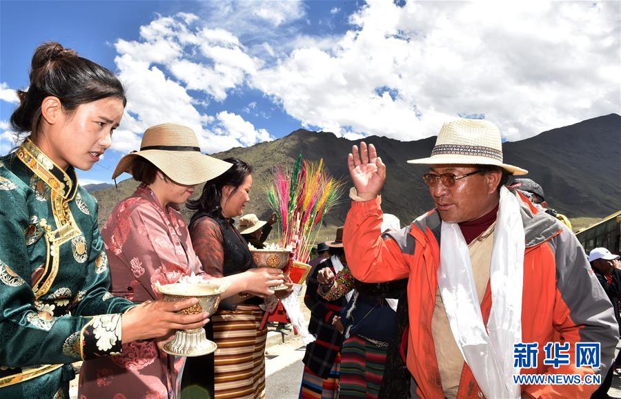 向來(lái)自遠(yuǎn)方的新鄰居敬獻(xiàn)青稞酒(2018年6月18日攝)。經(jīng)過(guò)兩天的馳騁,11輛大巴和31輛大貨車(chē)緩緩駛?cè)肜_市堆龍德慶區(qū)古榮鄉(xiāng)嘎沖村,標(biāo)志著西藏首個(gè)高海拔生態(tài)搬遷項(xiàng)目正式實(shí)施。新華社記者覺(jué)果攝