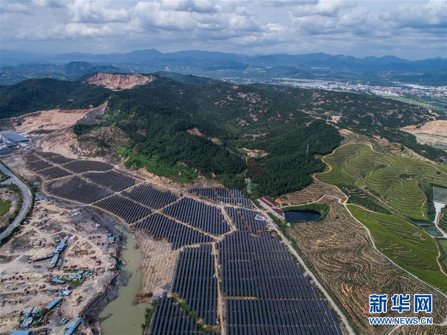 空中俯瞰湖州市埭溪鎮(zhèn)東紅村的光伏發(fā)電站(9月26日無人機(jī)拍攝)。該光伏電站占地2500多畝,是當(dāng)?shù)貜U棄礦坑通過改造建成的“農(nóng)光互補(bǔ)”光伏發(fā)電站。