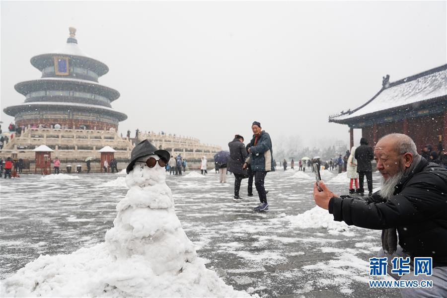 12月16日,在北京天壇公園,一名游客拍攝雪人。當(dāng)日,北京迎來(lái)降雪天氣。新華社記者鞠煥宗攝