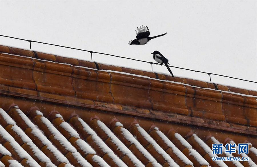 12月16日,在北京故宮,兩只喜鵲停在太和殿上。當(dāng)日,北京迎來(lái)降雪天氣。新華社記者金良快攝