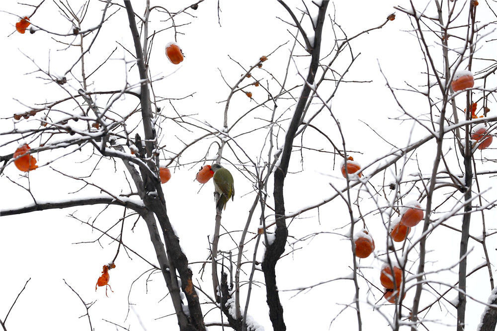 2019年11月30日,雪后的北京天壇公園內(nèi),鳥(niǎo)兒在柿子樹(shù)上覓食。29日,北京迎來(lái)2019年冬季初雪。富田(攝影部)/中新社/視覺(jué)中國(guó)