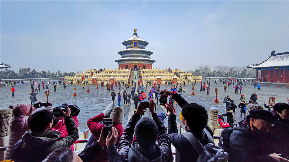 2019年11月30日,北京,初雪過后,天壇公園銀裝素裹,白雪古建相互映襯,景色迷人。天壇公園里觀雪賞景的市民絡(luò)繹不絕。喬?。垐D像/視覺中國(guó)