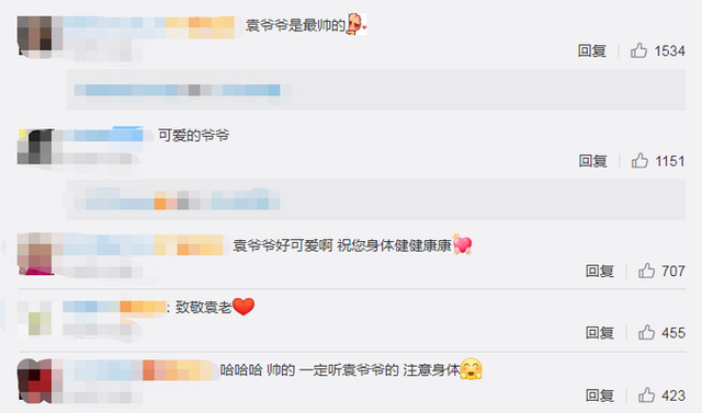 網(wǎng)友看后,紛紛評(píng)論,“袁爺爺是帥的”,“一定聽袁爺爺話注意身體”!