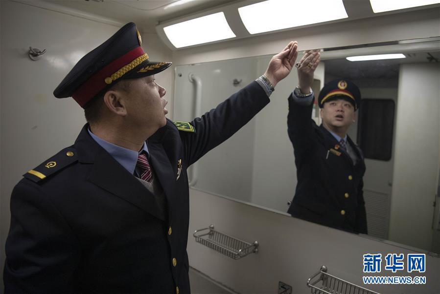1月11日,在太原開往青島北的K884次列車上,列車長趙耀在檢查車廂衛(wèi)生情況。新華社記者 楊晨光 攝