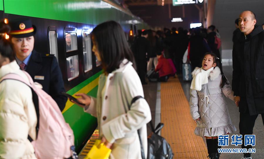 1月3日,卞菁值乘的動車到達南昌西站,朱梓芮(右二)在站臺邊呼喊正在引導乘客上車的母親。新華社記者 胡晨歡 攝