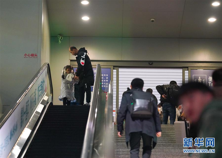 1月3日晚,朱梓芮(左一)在父親朱晨的陪同下前往南昌西站站臺(tái)準(zhǔn)備與母親團(tuán)聚。新華社記者 胡晨歡 攝