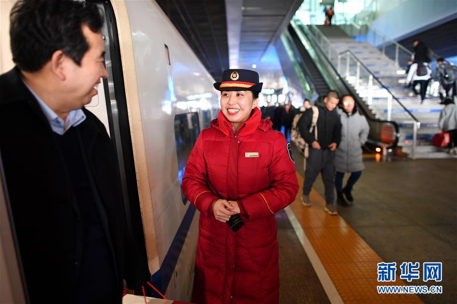 1月11日,在西安北站,列車(chē)長(zhǎng)陳海燕在站臺(tái)上目送旅客下車(chē)。新華社記者 詹彥 攝