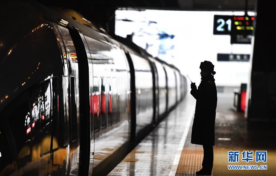 吉如在西安北站站臺(tái)上,與檢票口客運(yùn)人員聯(lián)控(1月14日攝)。今年春運(yùn)列車(chē)開(kāi)行密度大,站臺(tái)崗位人員緊張,吉如時(shí)常被調(diào)到站臺(tái)進(jìn)行站臺(tái)服務(wù)工作。 新華社記者 陶明 攝