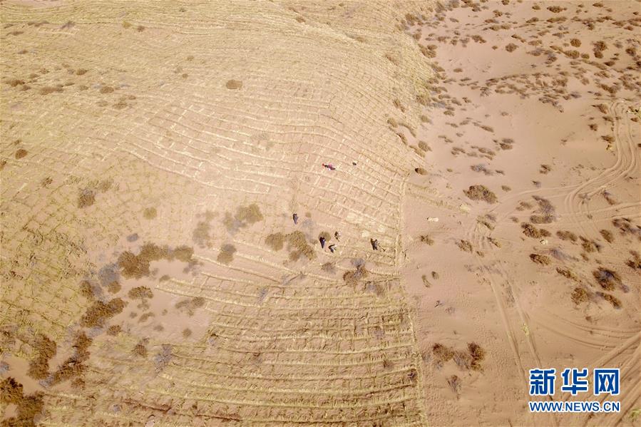 3月5日,在古浪縣北部沙區(qū)旱麻崗治沙點(diǎn),群眾扎草方格壓沙(無人機(jī)照片)。初春時節(jié),在騰格里沙漠南緣的甘肅省武威市古浪縣,當(dāng)?shù)馗刹柯毠ぜ鞍瞬缴沉謭鲋紊橙斯餐诳h城北部沙區(qū)旱麻崗治沙點(diǎn)開展春季治沙勞動。新華社記者 范培珅 攝