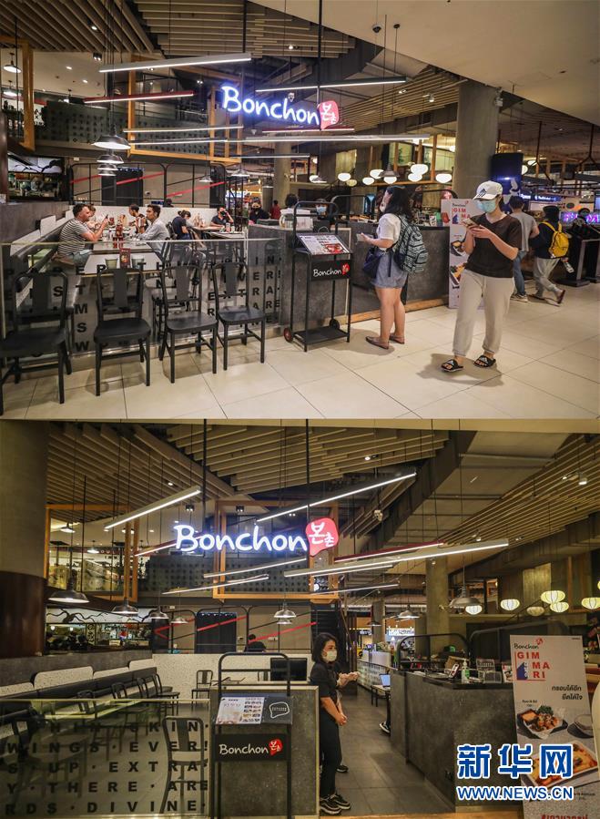 這是3月21日拍攝的泰國(guó)曼谷暹羅百麗宮商場(chǎng)負(fù)一層的美食城(上圖)和3月22日拍攝的美食城對(duì)比圖。商場(chǎng)除了負(fù)一層的美食城和超市外,全部關(guān)閉。美食城只對(duì)顧客提供外賣服務(wù)。新華社記者張可任攝