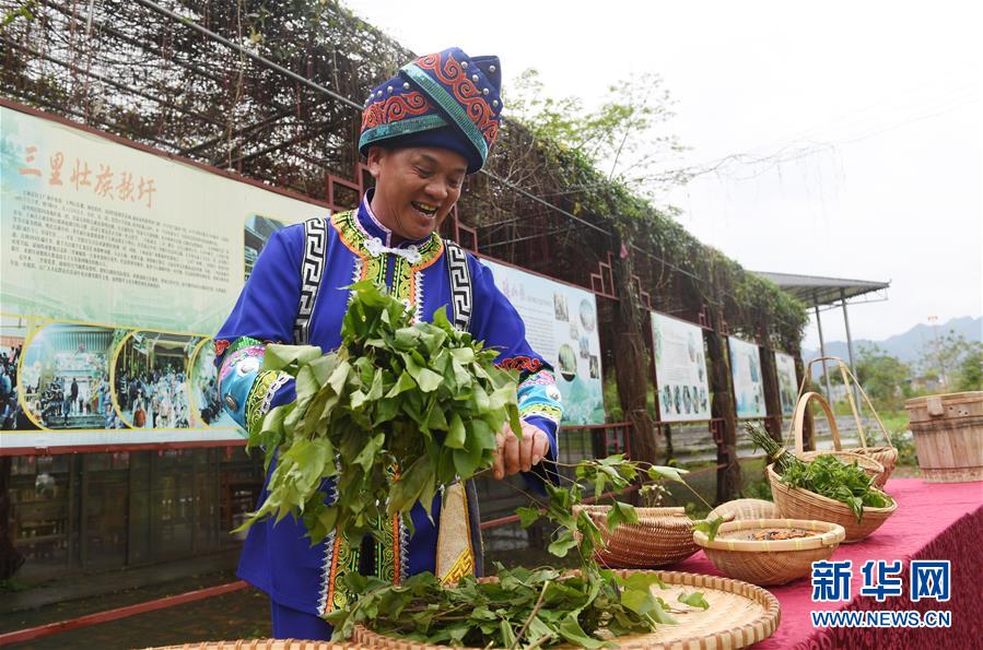 3月25日,在廣西上林縣巷賢鎮(zhèn),一名壯族村民在準(zhǔn)備做五色糯米飯。新華社記者陸波岸攝