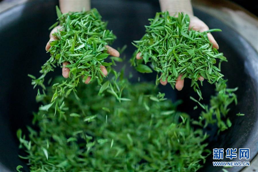 4月25日,工作人員在“扶貧茶園”內(nèi)制作綠茶。谷雨過后,在貴州省黔東南苗族侗族自治州丹寨縣“扶貧茶園”,茶農(nóng)搶抓農(nóng)時(shí)趕制春茶。丹寨縣創(chuàng)新產(chǎn)業(yè)扶貧模式,鼓勵社會公眾線上認(rèn)領(lǐng)茶園,再由茶園聘請當(dāng)?shù)刎毨魟?wù)工,為貧困戶創(chuàng)造茶園管理、采茶、制茶等就業(yè)機(jī)會,幫助貧困戶增收。今年以來,“扶貧茶園”已接受線上預(yù)訂600余畝,給當(dāng)?shù)?00余名村民提供了就業(yè)機(jī)會。新華社記者歐東衢攝