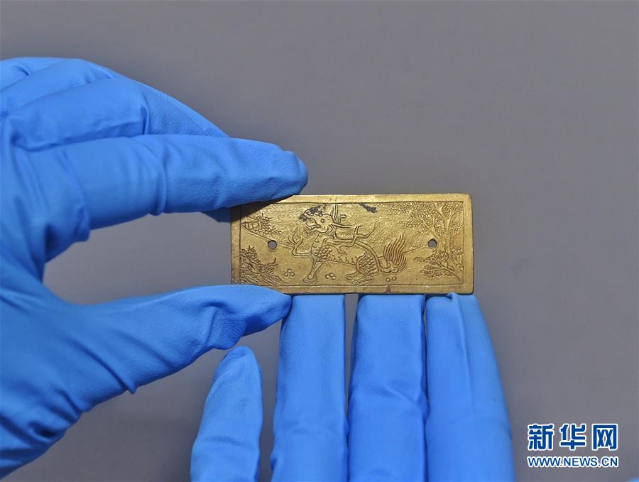 這是發(fā)掘出水的麒麟紋金牌飾(4月15日攝)。新華社記者劉坤攝
