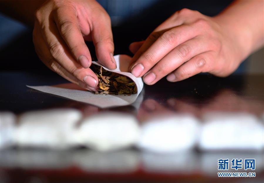方舟在對新研發(fā)出的白雞冠茶用傳統(tǒng)綿紙進(jìn)行緊壓包裝(5月10日攝)。新華社記者魏培全攝